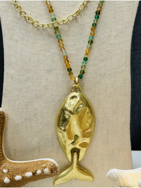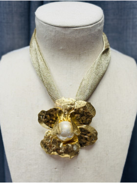 Original et élégant, ce collier de 46 cm associe de gros anneaux métalliques traversés par un tissu natté doré.