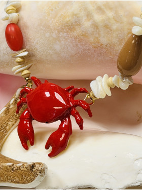 Les coquillages, dans un ton beige taupe délicat, sont agrémentés de petits éléments pendants : un homard et des mini coquillages et poissons en métal doré fantaisie, apportant une touche ludique et raffinée.