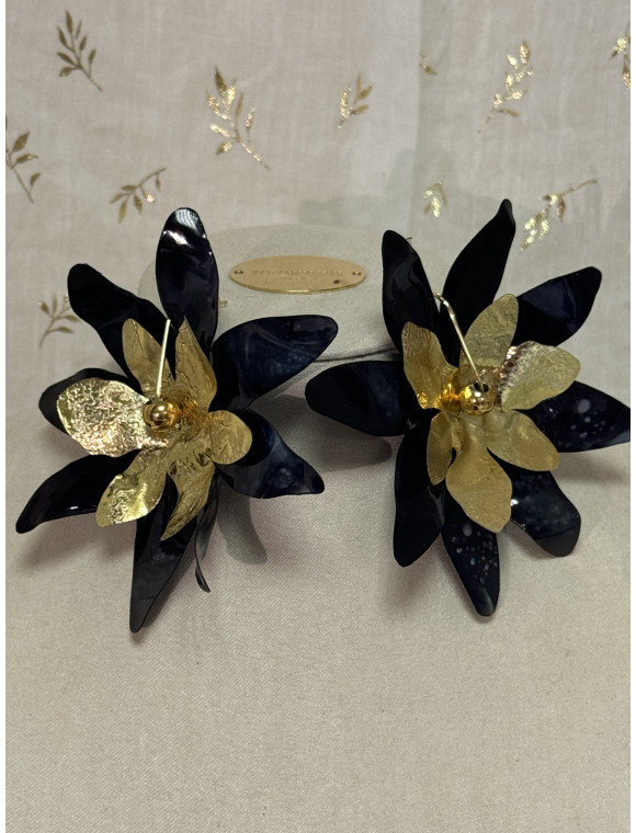 Boucles en métal dorée agrémentées de fleurs en plastique chauffé.